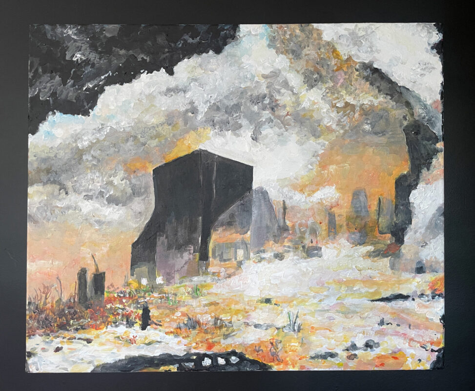 Les peintures sont réalisées à l’acrylique sur toile, aux formats variables. Elles résultent d’un double processus : génération algorithmique en amont, transposition picturale en aval. Les compositions oscillent entre figuration et abstraction, et convoquent des éléments récurrents (monolithes, structures isolées, paysages fragmentés, résidus géologiques ou technologiques).