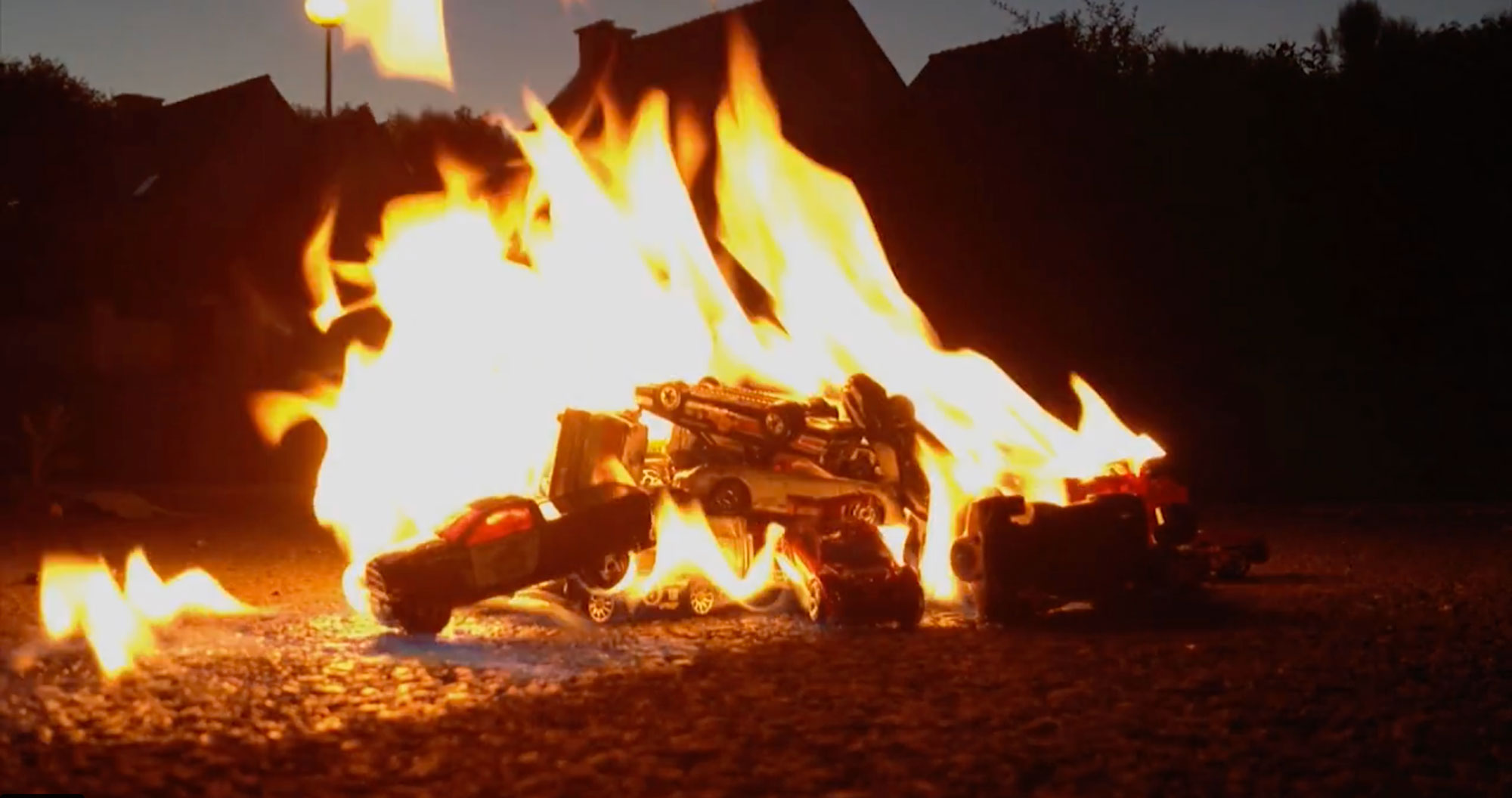 La vidéo End Play (2012)¹¹ de Reynald Drouhin semble échapper au risque de confusion avec la réalité. Elle montre, de nuit, un bûcher composé de voitures miniatures, embrasé par un jet de flammes. Huit minutes sont nécessaires pour que le plastique se rétracte et se transforme en un amas informe. Drouhin accompagne la vidéo, sur son site internet, d’un commentaire : « L’œuvre explore la destruction et la fin d’un monde, avec l’effet hypnotique des flammes. »